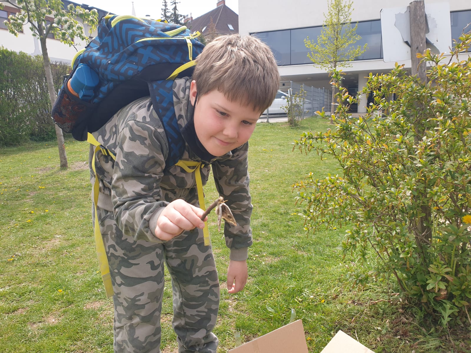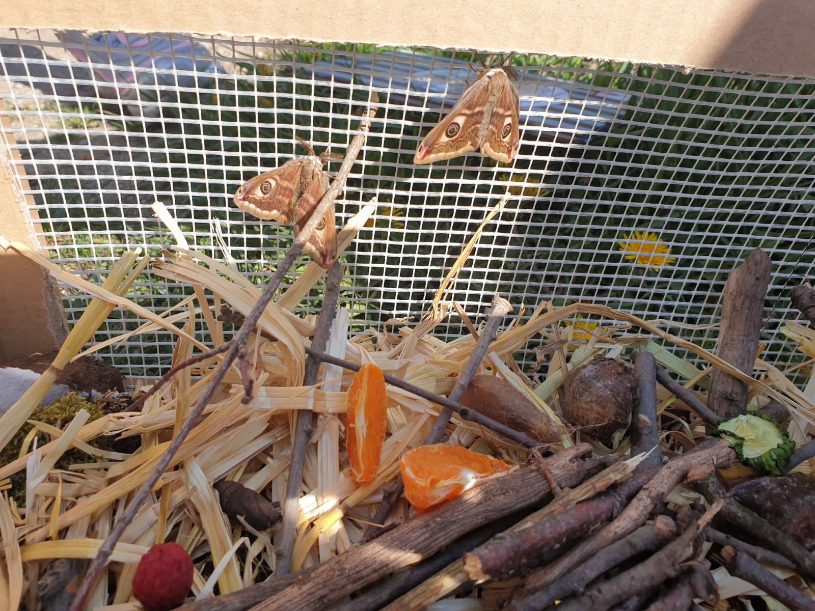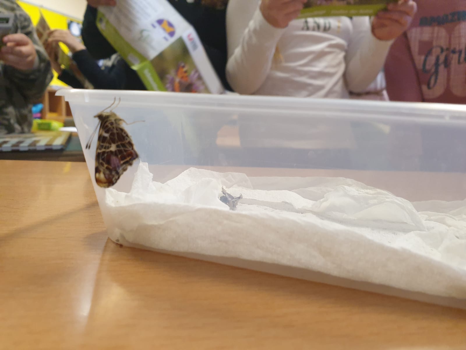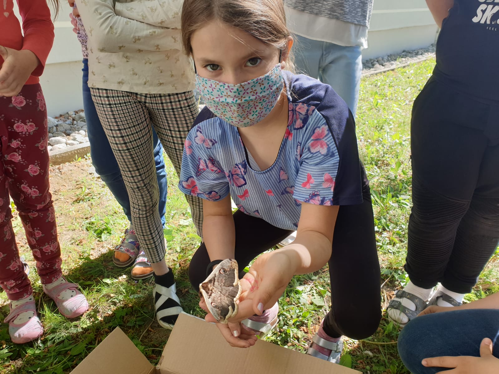 Das ist die Frage! Die Kinder waren ganz eifrig am Bestimmen – und bald war das Geheimnis gelüftet: zuerst schlüpfte das Kleine, und jetzt das Wiener Nachtpfauenauge! Das ist ja riesig! „Die Kinder waren sehr aufgeregt, es ist echt spannend für uns!“ berichtet Claudia Ostermayer aus der 3. Klasse. Sehr behutsam wurden alle im Freien ausgesetzt. Und dann tauchte plötzlich das Landkärtchen auf! „Wie der wohl hierher kam?“ Aus der winzigen Puppe geschlüpft!