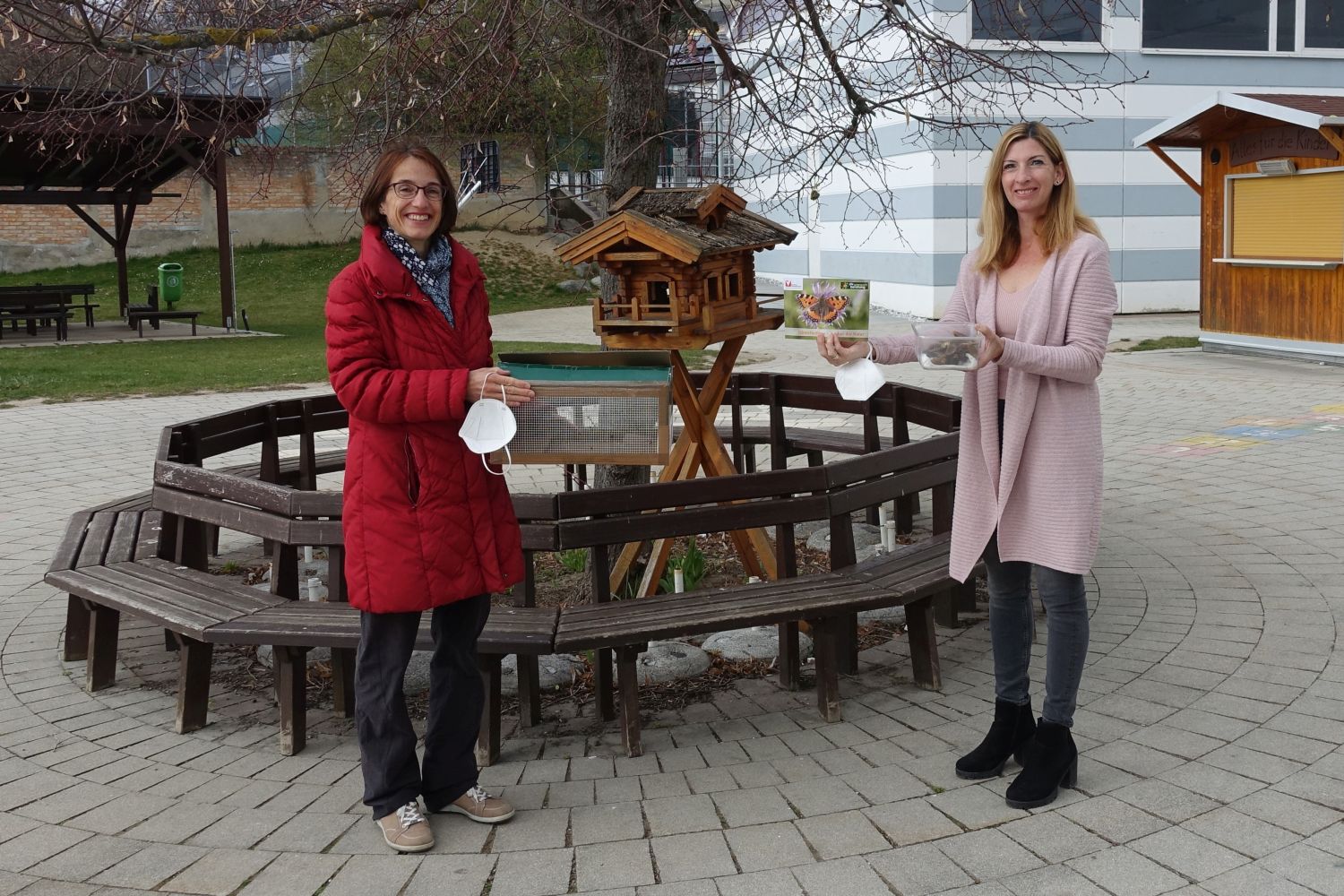 Um die Vorfreude auf die 2. Insektenwerkstatt wachsen zu lassen, erhält Frau Direktorin Silke Teuschl heute schon ein Puppenhaus für ihre Schüler*innen. Fünf verschiedene Schmetterlingsarten warten in ihren Kokons bzw. Puppen nun darauf, beim Schlüpfen von den Kindern beobachtet zu werden. Bei einem kurzen Ausflug in die nahen Streuobstwiesen und das Feuchtgebiet vergewissert sich die Projektbetreuerin, ob schon genug Nahrungsquellen für die Falter in der Nähe sind. Und siehe da: Kirschbäume, Schlehen und Sumpfdotterblumen sind schon in voller Blüte!