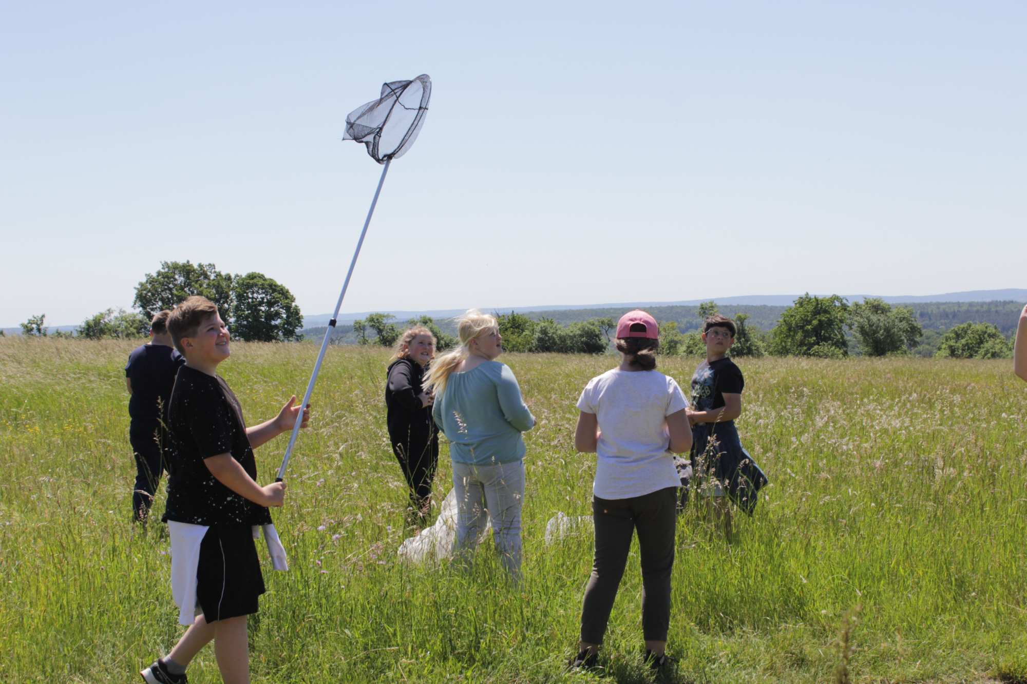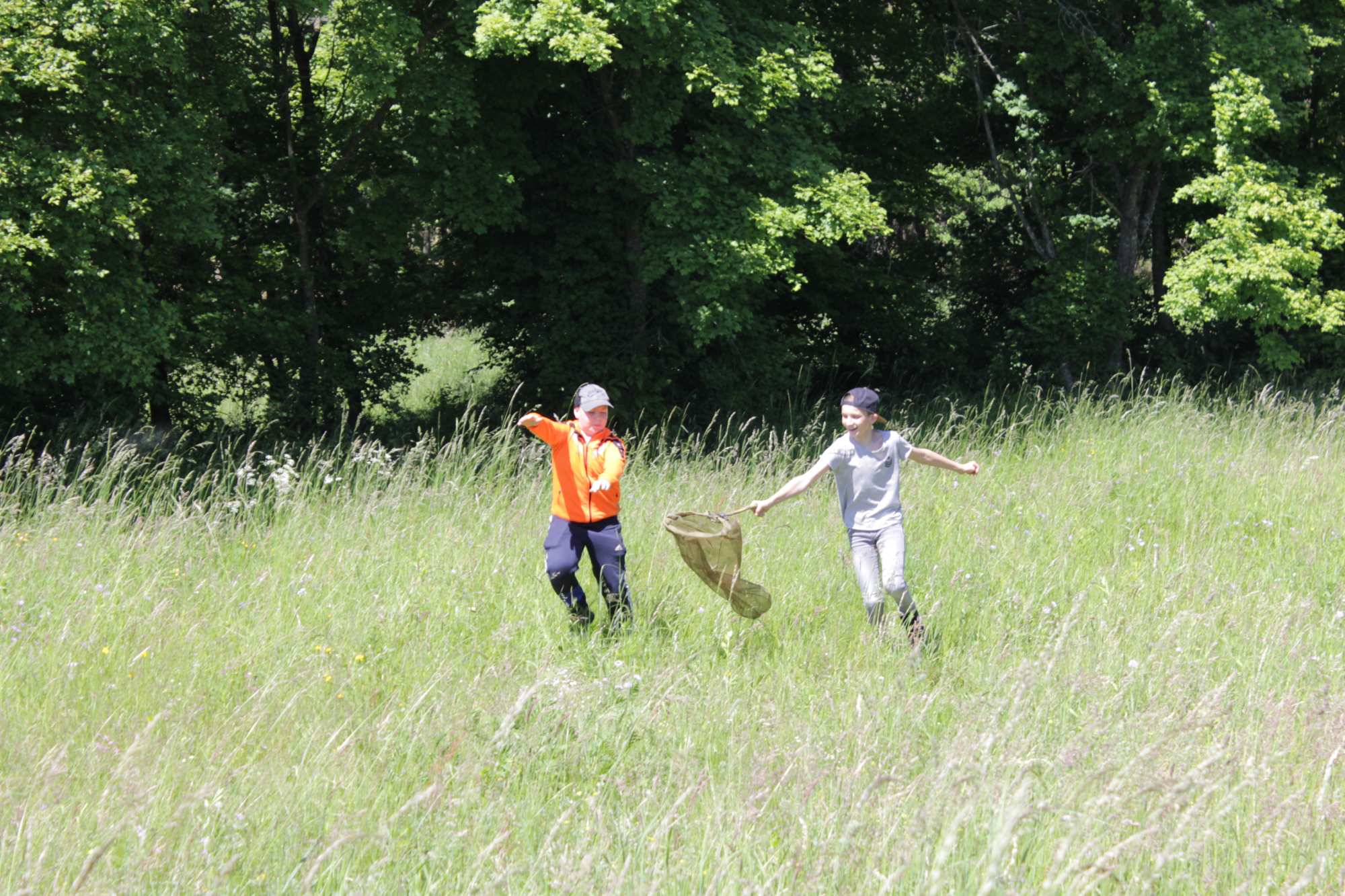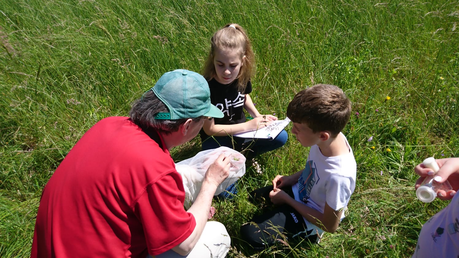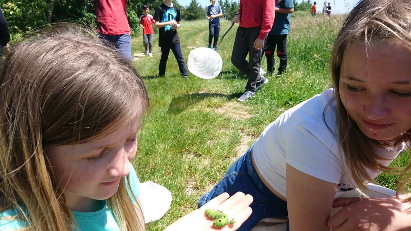 Nachdem im Puppenhaus auch noch der letzte Falter geschlüpft ist – ein Ligusterschärmer – können wir endlich wieder gemeinsam den Biri erkunden! Das Wetter spielt alle Stückerln und entsprechend gut gelaunt und unternehmenslustig sind die 38 Kinder, drei Pädagoginnen und drei Betreuer*innen! Mit Insekten aufspüren, Blumennamen herausfinden, sich von fetten Raupen kitzeln lassen und allerlei anderen Spielen vergeht die Zeit wie im Flug. Die Liste der heute entdeckten Arten ist lange und mit ein wenig Unterstützung identifizieren die Kinder auch weniger bekannte, attraktive Arten wie Weißlinien- und Smaragdspanner oder Mausohr-Habichtskraut rasch!